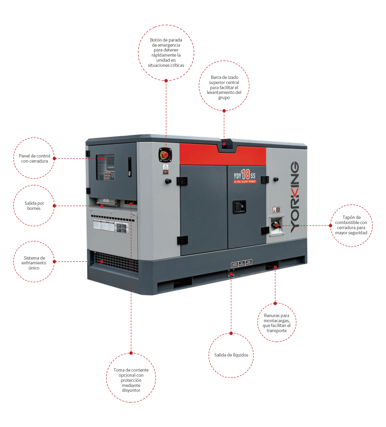 Depósito de combustible base de gran capacidad: garantiza largos tiempos de funcionamiento, tanque de doble capa opcional con bandeja de retención de líquidos.